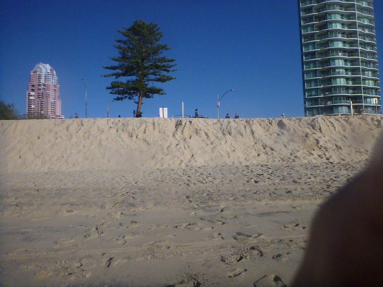 先週の大波で砂がもっていかれて、ビーチはこんな崖みたいになってます