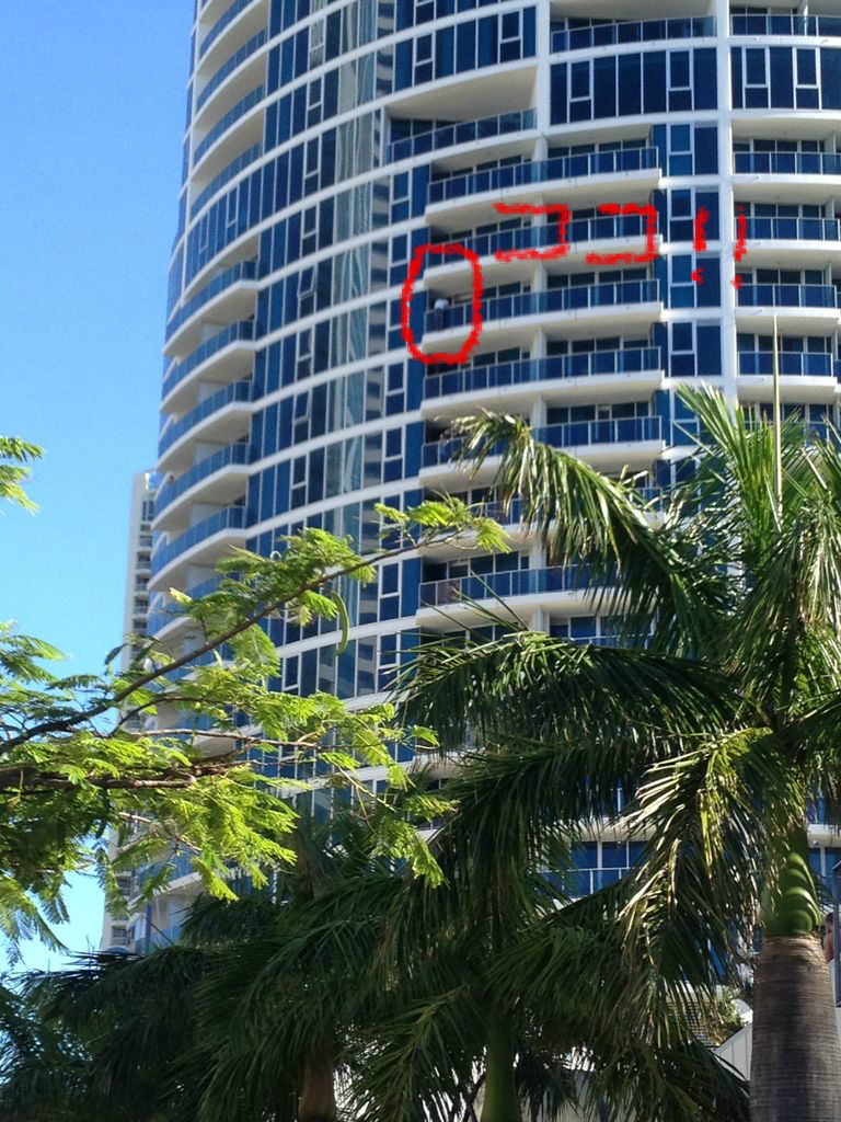 ヒルトンの20階位?!で、ベランダの柵に手を引っ掛けて・・・・